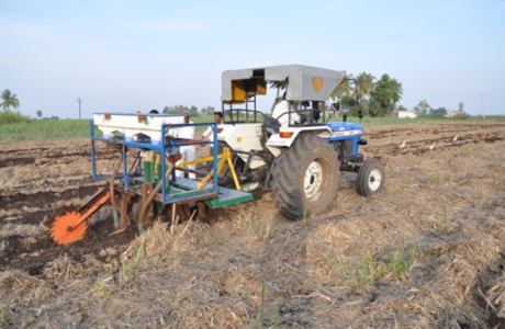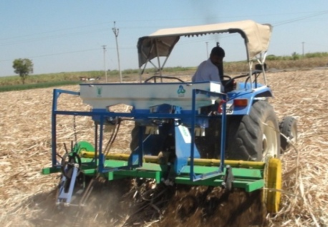 - A stubble shaver, off bar cum fertilizer applicator upgraded with the inclusion of larger capacity fertilizer box and root pruning mechanism for improving the cane yield and N-use efficiency of sugarcane ratoon crop under surface retention of trash